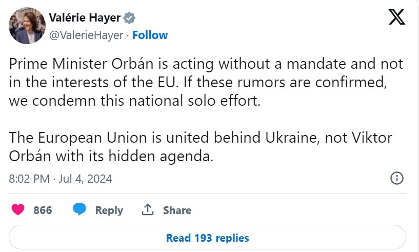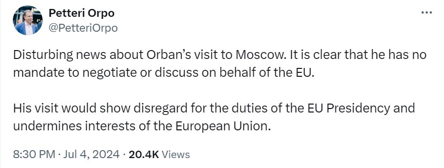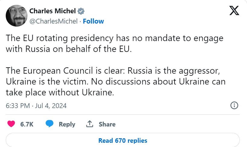 По првите извештаи во четвртокот за можна средба Орбан-Путин во Москва, претседателот на Европскиот совет Шарл Мишел напиша на Икс: „Ротационото претседателство со ЕУ нема мандат да соработува со Русија од името на ЕУ.“