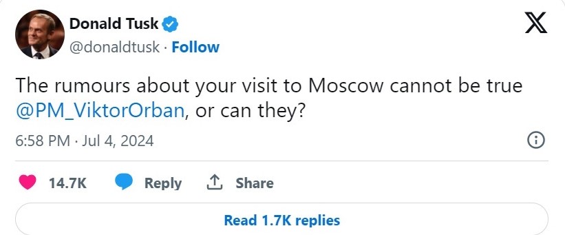 Полскиот премиер Доналд Туск ја доведе во прашање одлуката: „Гласините за вашата посета на Москва не може да бидат вистинити, Виктор Орбан, или се?“, напиша тој на Икс.