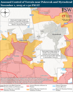 Американскиот институт за проучување на војната (ИСВ) оценува дека украинските сили постигнале „мал напредок“ за време на неодамнешните контранапади северно од Покровск, но дека градот е „во голема мера спорна „сива зона““.