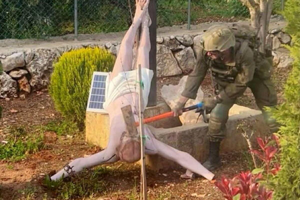 Агенцијата Ројтерс денес објави фотографија на која се гледа како израелски војник оштетува статуа на Исус во градот Дибел, во Либан.