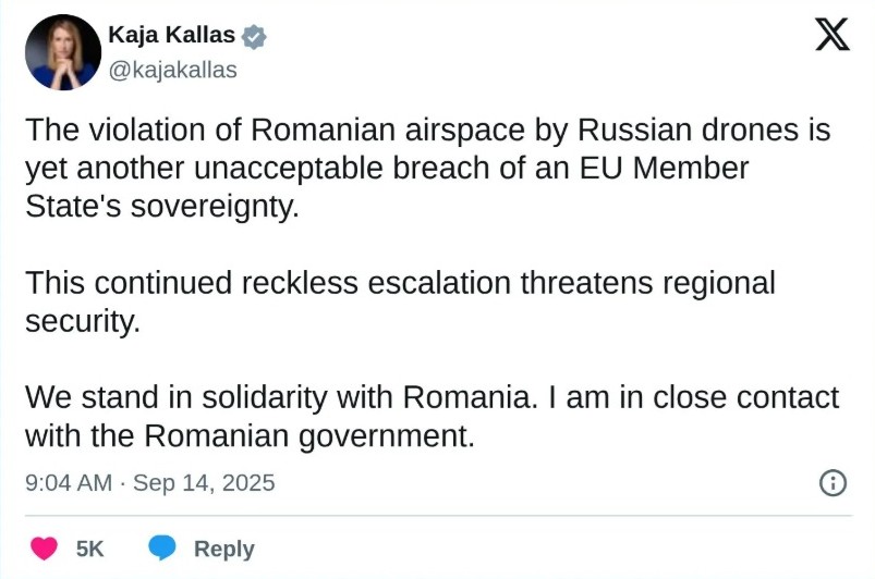 Каја Калас, шефицата за надворешна политика на ЕУ, вчера на Икс ги осуди руските беспилотни летала што го нарушија романскиот воздушен простор, нарекувајќи го тоа кршење на суверенитетот на ЕУ и закана за регионалната безбедност, изразувајќи солидарност со Романија.