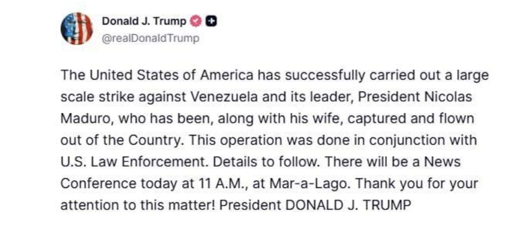 Американскиот претседател додаде дека венецуелскиот претседател Николас Мадуро бил заробен и изведен од земјата заедно со сопругата.