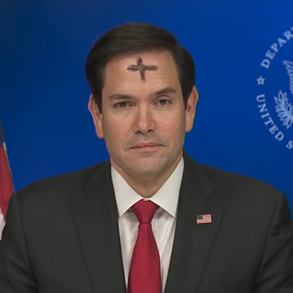U.S. Secretary of State Marco Rubio draws a cross on his forehead during a press conference to discuss Trump’s positions. pic.twitter.com/YWdBTJKfzi