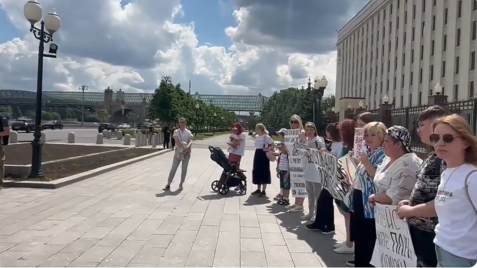 Сопругите застанаа пред портата на Министерството со транспаренти дека бараат враќање на нивните сопрузи од фронтот. Една од нив објави фотографии на Телеграм.