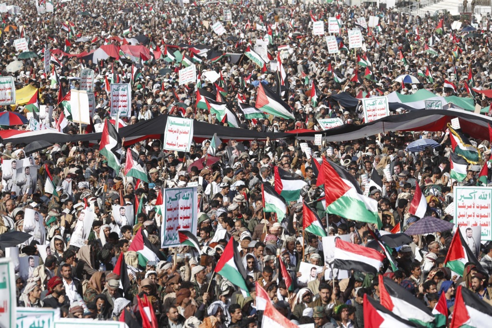 „Смрт за Америка, смрт за Израел“ се слушаа од морето луѓе, кои носеа јеменски и палестински знамиња на огромниот плоштад во историскиот центар на градот.