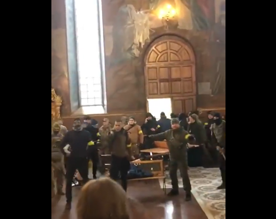Вчера во катедралата, која е прогласена за гарнизонска црква на украинските вооружени сили, се одржувала литургија кога упаднале околу 100 маскирани лица. Припадниците на Украинската православна црква на Московската патријаршија ја скршиле влезната врата и фрлиле солзавец врз толпата верници на Православната црква на Украина.