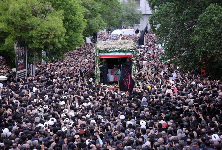 Толпата се насобра околу камионот, а луѓето се обидуваа да ги стават рацете на ковчегот на Раиси и другите жртви.
