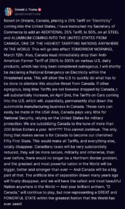 „Единственото нешто кое би имало смисла е Канада да стане наша драга 51 сојузна држава. Со тоа царините, и сè останато, целосно би исчезнало. Даноците на Канаѓаните би им биле значително намалени, би биле побезбедни, воено и воопшто, повеќе од кога било претходно, повеќе не би постоел проблемот на северната граница, а најголемата и најмоќна нација во светот ќе биде поголема, подобра и посилна од кога било“, напиша Трамп.