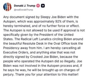 „Секој документ потпишан од Поспаниот Џо Бајден со автоматско пенкало, или приближно 92 отсто од нив, со ова се поништува и повеќе нема никаква сила или ефект. Автоматското пенкало не може да се користи освен со посебно овластување од претседателот на Соединетите Американски Држави. Радикално левичарските луди луѓе кои го опкружуваа Бајден околу прекрасната претседателска маса во Овалната соба го лишија од претседателството. Со ова ги поништувам сите извршни наредби и сè друго што не е директно потпишано од Нечесниот Џо Бајден, бидејќи луѓето што го користеле автоматското пенкало го направиле тоа нелегално. Џо Бајден не беше вклучен во процесот на автоматско потпишување и ако каже дека бил, ќе биде обвинет за лажно сведочење. Ви благодариме за вашето внимание на ова прашање!“, порача Трамп.