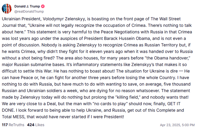 „Украинскиот претседател Володимир Зеленски се пофали на насловната страница на Волстрит џурнал: ‘Украина нема законски да ја признае окупацијата на Крим. Таму нема што да се преговара.’ Оваа изјава сериозно им штети на мировните преговори со Русија, бидејќи Крим беше загубен пред многу години, кога Барак Хусеин Обама беше претседател на Соединетите Држави, а денес не е ни предмет на дискусија.