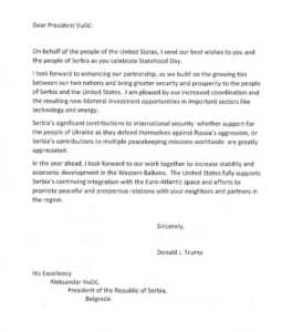 „Почитуван претседателе Вучиќ, во име на народот на Соединетите Американски Држави, ви упатувам вам и на граѓаните на Србија најискрени честитки по повод Денот на државноста“, го цитира Вучиќ писмото од Вашингтон. Трамп особено ѝ се заблагодарува на Србија за залагањето за мир низ светот.