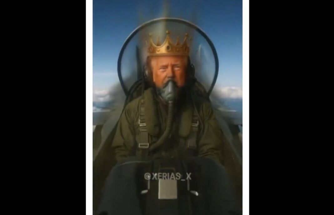 На видеото, тој носи круна, лета во борбен авион на кој пишува „КРАЛ ТРАМП“ и бомбардира толпа демонстранти со кафеава течност.