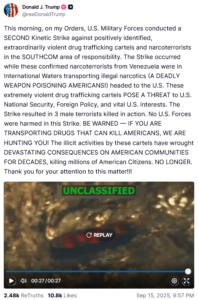 „Нападот се случил додека овие потврдени наркотерористи од Венецуела биле во меѓународни води превезувајќи нелегални наркотици (смртоносно оружје кое ги труе Американците!) во САД“, напиша Трамп на неговата социјална мрежа Трут соушал. Според него, три лица на бродот биле убиени во нападот. Две недели претходно, тој објави сличен напад во кој загинаа 11 лица. Нападите дојдоа по зголемувањето на силите на американската морнарица во близина на Венецуела.
