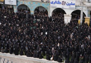 Иранската државна телевизија денес прикажа снимки од илјадници луѓе собрани на јавен плоштад во Минаб. Мажите мавтаа со знамето на Исламската Република, главно стоејќи одделно од жените облечени во црно.