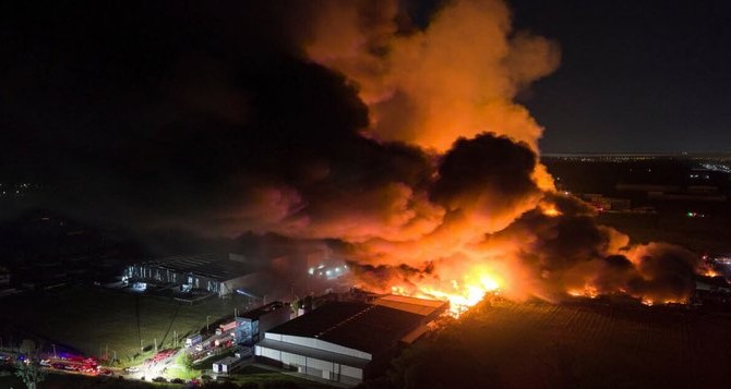 Густ црн чад се креваше стотици метри во воздухот, а пожарникарите сè уште се бореа со пожарот во саботата наутро, пренесува Франс 24.