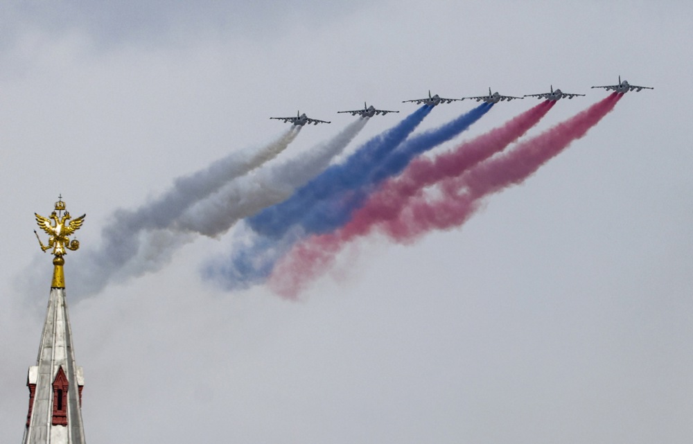 Небото над Црвениот плоштад беше обоено со боите на знамето на Руската Федерација од група од шест јуришни авиони Су-25БМ.