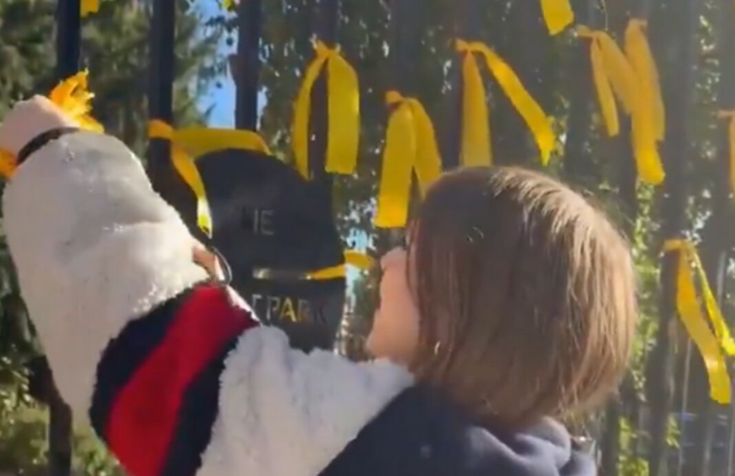 Despicable woman cutting down Hostage Ribbons placed by the Jewish Community of Muswell Hill in London