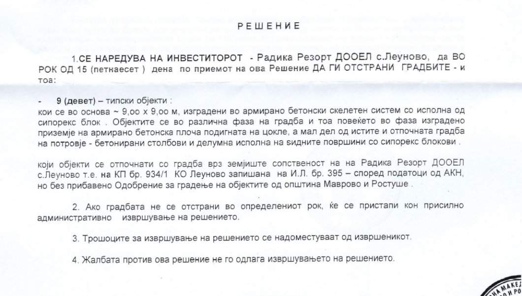 Да не заборавиме и тоа дека за овој случај Управата за финансиска полиција до Основното јавно обвинителство Гостивар на 5 октомври поднесе кривична пријава против две физички лица во својство на управители во правниот субјект ДТТУ Радика резорт ДООЕЛ увоз-извоз. А три дена потоа и поднесена е и трета кривична пријава за дивоградбите во Леуново против Ш.Р. (42) од Косово, поради сомневање за сторено кривично дело бесправна градба. И пак никому ништо.